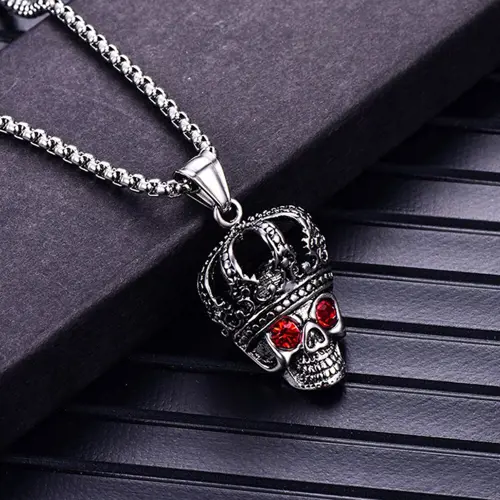 Stainless Steel Punk Rock Men Skull Pendant Necklace with Red Eyes Halloween Gifts For Him