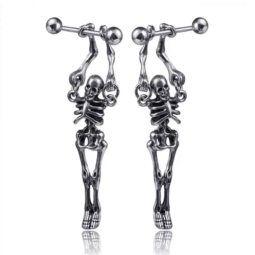 1 Pair Gothic Earrings Men Stainless Steel Skeleton Skull Stud Earrings Antique Silver Skull Human Body Punk Earrings Halloween Jewelry