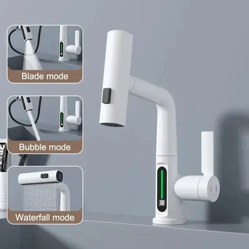 Temperature LED Digital Display Waterfall Bathroom Basin Faucets with Pull Down Stream Sprayer Hot Cold Water Tap Faucets