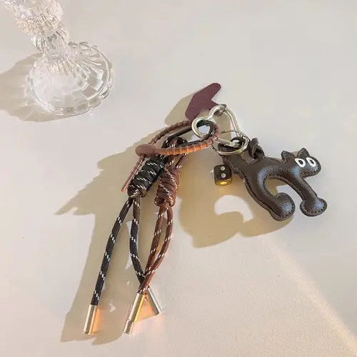 Fluffy Kawaii Leather Bow-backed Cat Shape Keychain Fashion Vintage Nylon Rope Pendant Phone Shell Lanyard With Clip Bag Charms