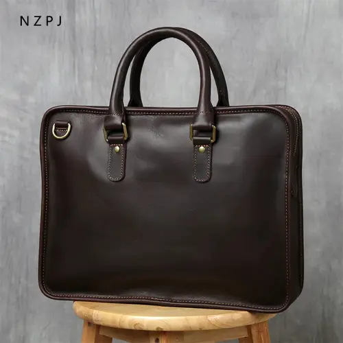 NZPJ Retro Men's Briefcase Leather Laptop Bag Top Layer Cowhide Casual Handbag 14 Inch Business Shoulder Bag Messenger Bag